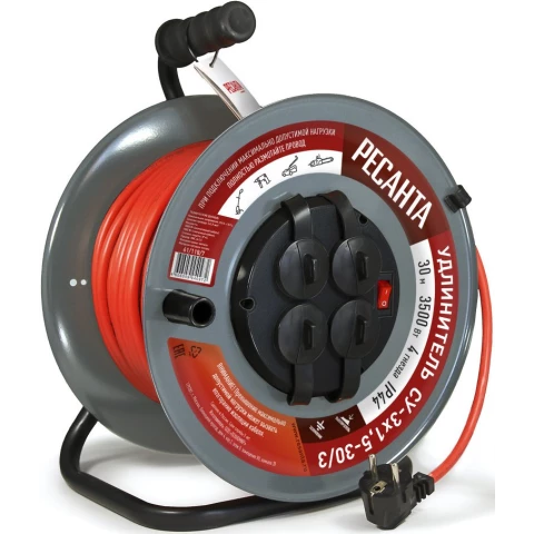 | удлинитель, 4 розетки, макс. нагрузка 3500 Вт, заземление, выключатель на корпусе, длина кабеля: 30 м, красный | 924 смн. |