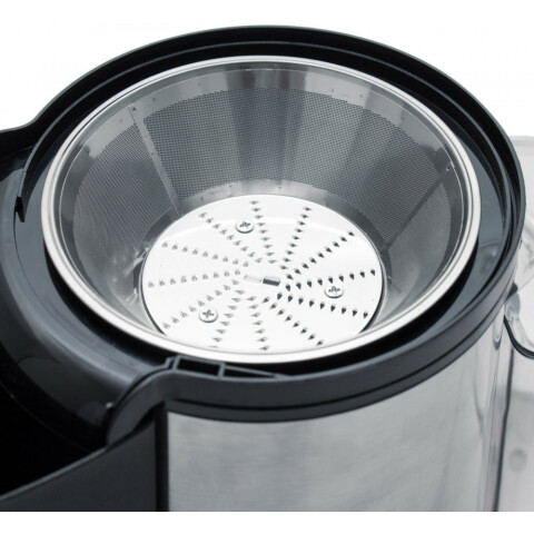 центробежная соковыжималка, мощность 700 Вт, стакан для сока в комплекте, подача сока сразу в стакан, противокапельная система, автоматический выброс мякоти, корпус из нержавеющей стали, возможность загрузки целых плодов