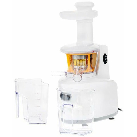 шнековая соковыжималка, мощность 150 Вт, стакан для сока в комплекте, подача сока сразу в стакан, автоматический выброс мякоти, корпус из пластика