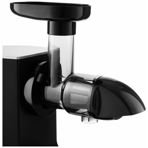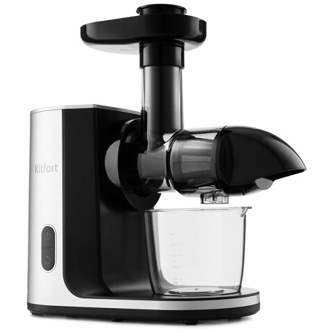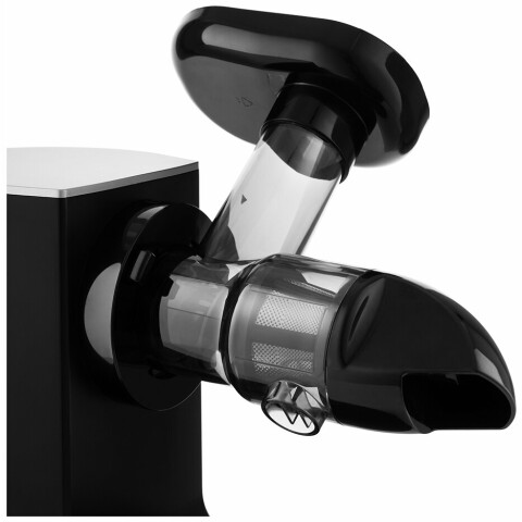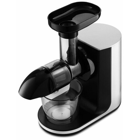 горизонтальная шнековая соковыжималка, количество шнеков: 1, мощность 150 Вт, стакан для сока в комплекте, подача сока сразу в стакан, автоматический выброс мякоти, корпус из пластика, возможность загрузки целых плодов