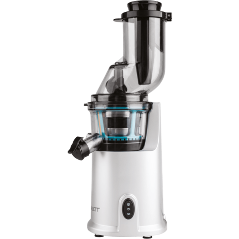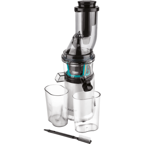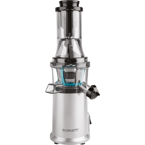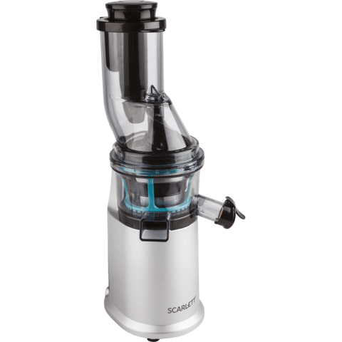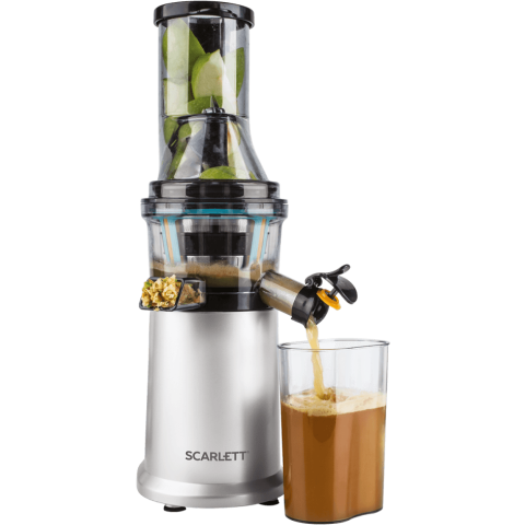 Бренд: Scarlettвертикальная шнековая соковыжималка, количество шнеков: 1, мощность 250 Вт, стакан для сока в комплекте, подача сока сразу в стакан, противокапельная система, автоматический выброс мякоти, корпус из пластика, возможность загрузки целых плодов