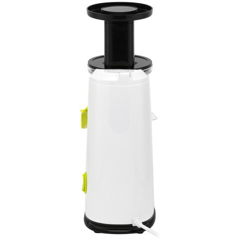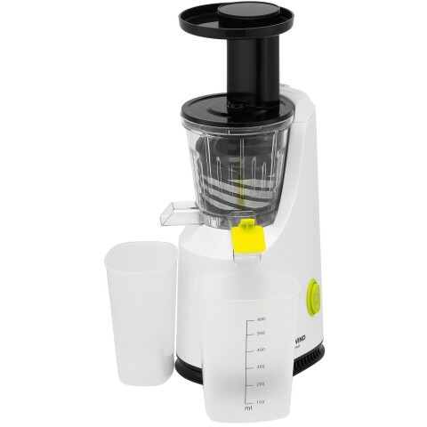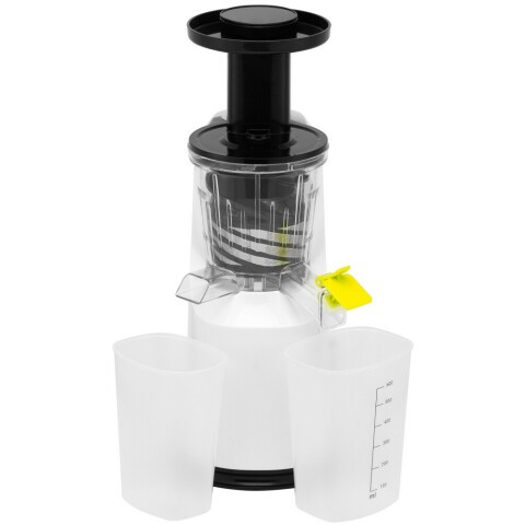 мощность 200 Вт, объём резервуара для сока 600 мл, объём резервуара для мякоти 800 мл, максимальная скорость вращения 60 об/мин, материал корпуса пластик