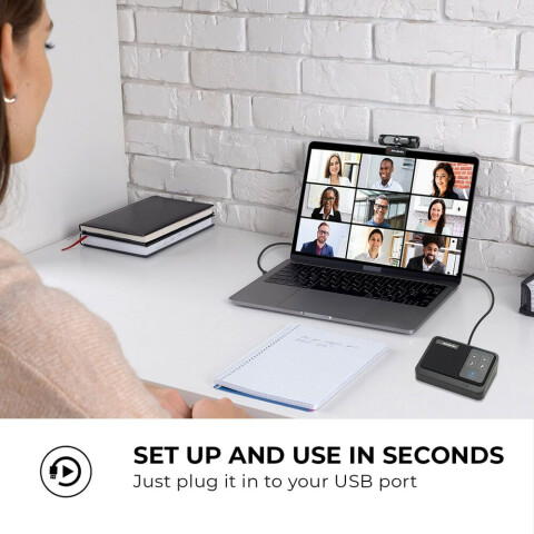 спикерфон, интерфейс USB, динамик 3 Вт, 150 - 14 000 Гц, микрофон 150 - 7000 Гц, чувств. -29 дБ, работа с Windows, macOS, поддержка приложений Skype, Zoom, MS Teams, Google Meet, Cisco Webex