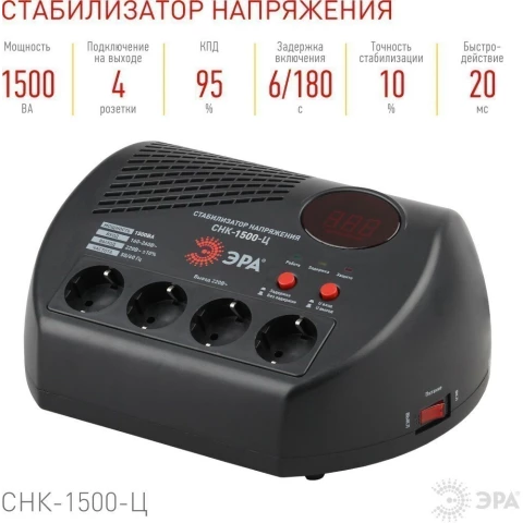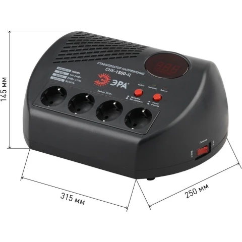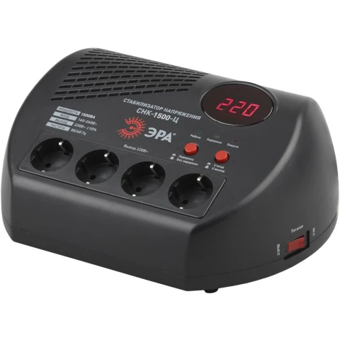Бренд: ЭРАрелейный стабилизатор, мощность 1500 Вт, входное напряжение 160-260 В, выходное напряжение 220 В, дисплей