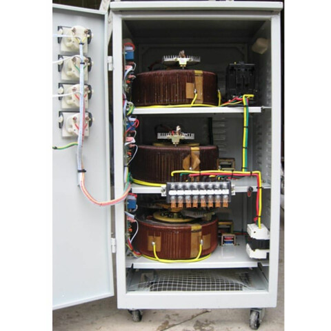 электромеханический стабилизатор, мощность 15000 Вт, входное напряжение 210-475 В, выходное напряжение 380 В, дисплей