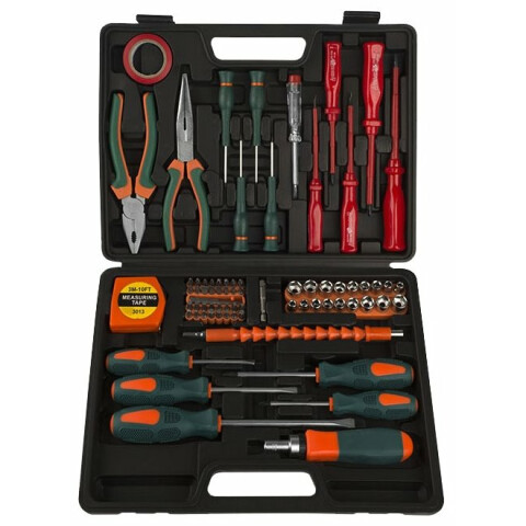 набор инструментов электромонтажный, количество предметов: 72, отвертки, 15 шт, биты, 32 шт, торцевые головки, 18 шт, рулетка, пассатижи, круглогубцы, кейс в комплекте
