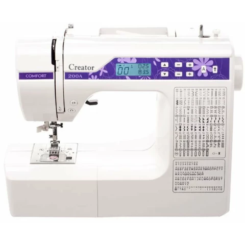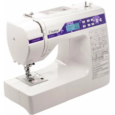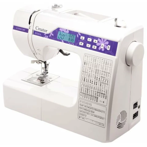 электронное управление, петля-автомат, ротационный горизонтальный челнок, 189 швейных операций, макс. ширина строчки: 7 мм, макс. длина стежка: 4.5 мм, освещение, кнопка реверса