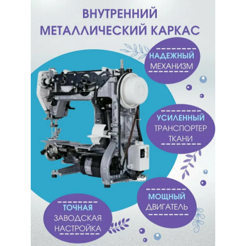 электромеханическое управление, петля-автомат, качающийся челнок, 25 швейных операций, макс. длина стежка: 4 мм, освещение