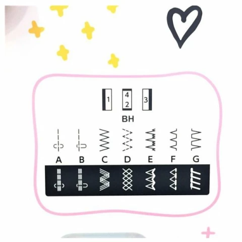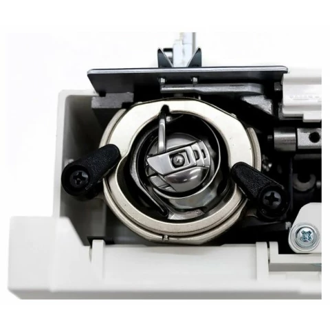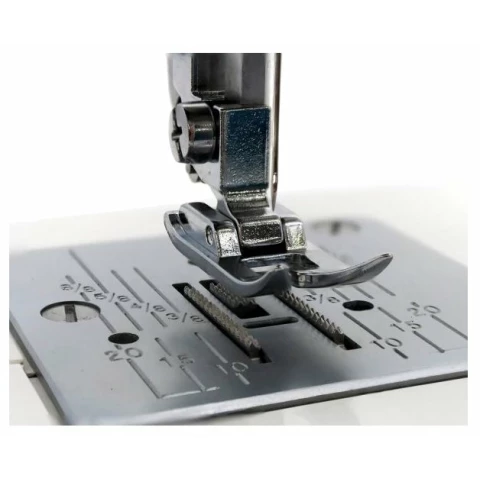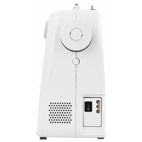 электромеханическое управление, петля-полуавтомат, качающийся челнок, 15 швейных операций, макс. ширина строчки: 5 мм, макс. длина стежка: 4 мм, освещение, кнопка реверса