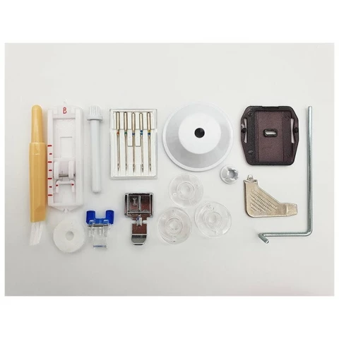 электромеханическое управление, петля-полуавтомат, качающийся челнок, 23 швейных операций, макс. ширина строчки: 5 мм, макс. длина стежка: 4 мм, освещение