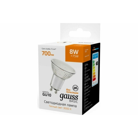 цоколь GU10, мощность 8 Вт, тёплый белый цвет, цветовая температура 3000 K, световой поток 700 Лм, 220 В, до 15000 ч работы, 1 шт.
