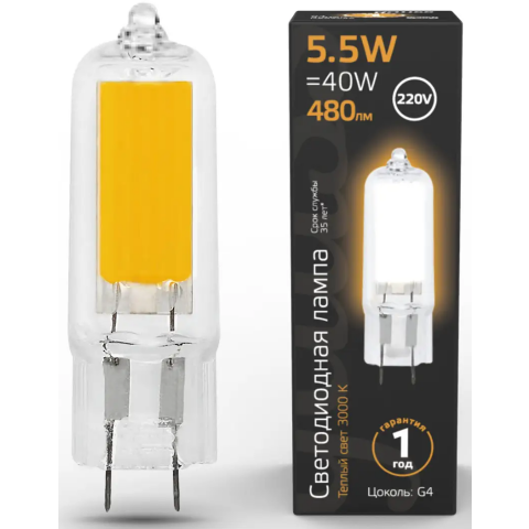 цоколь G4, мощность 5.5 Вт, тёплый белый цвет, цветовая температура 3000 K, световой поток 480 Лм, 220 В, до 35000 ч работы, 1 шт.