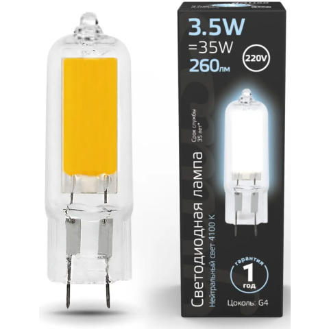 цоколь G9, мощность 3.5 Вт, нейтральный белый цвет, цветовая температура 4100 K, световой поток 260 Лм, 220 В, до 35000 ч работы, 1 шт.