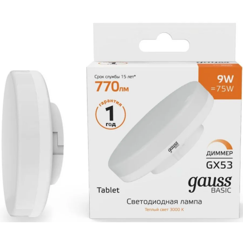 цоколь GX53, мощность 9 Вт, тёплый белый цвет, цветовая температура 3000 K, световой поток 770 Лм, до 15000 ч работы, 1 шт.