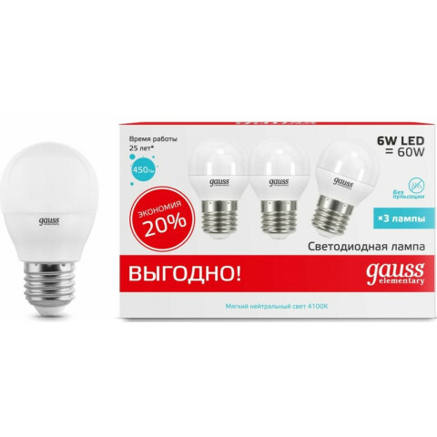 цоколь E27, мощность 6 Вт, нейтральный белый цвет, цветовая температура 4100 K, световой поток 450 Лм, 220 В, до 25000 ч работы, 3 шт.