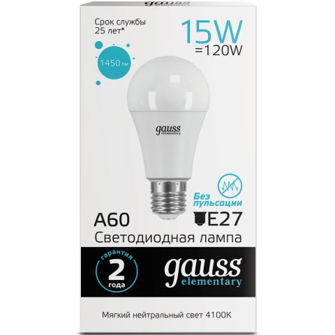 цоколь E27, мощность 15 Вт, нейтральный белый цвет, цветовая температура 4100 K, световой поток 1450 Лм, 220 В, до 25000 ч работы, 1 шт.