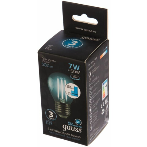 цоколь E27, мощность 7 Вт, нейтральный белый цвет, цветовая температура 4100 K, световой поток 580 Лм, 220 В, до 35000 ч работы, 1 шт.