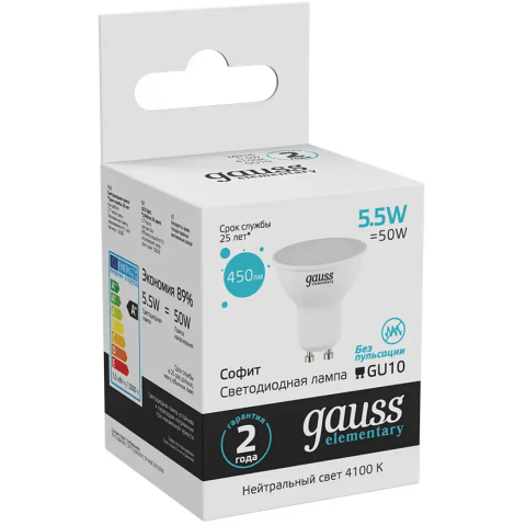 цоколь GU10, мощность 5.5 Вт, нейтральный белый цвет, цветовая температура 4100 K, световой поток 450 Лм, 220 В, до 25000 ч работы, 10 шт.