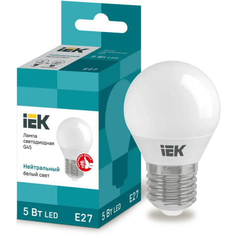Бренд: IEKцоколь E27, мощность 5 Вт, нейтральный белый цвет, цветовая температура 4000 K, световой поток 450 Лм, 230 В, до 30000 ч работы, 1 шт.