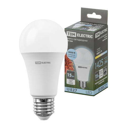 Бренд: TDM ELECTRICцоколь E27, мощность 15 Вт, нейтральный белый цвет, цветовая температура 4000 K, световой поток 1425 Лм, 220 В, до 30000 ч работы, 1 шт.