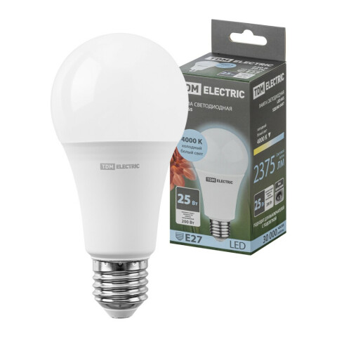 Бренд: TDM ELECTRICцоколь E27, мощность 25 Вт, нейтральный белый цвет, цветовая температура 4000 K, световой поток 2375 Лм, 220 В, до 30000 ч работы, 1 шт.