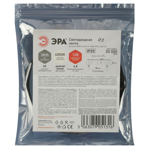 светодиодная лента длиной 60 м, нейтральный белый цвет, светодиоды SMD 2835, мощность 4.8 Вт/м, цветовая температура 4000 K, световой поток 400 Лм, питание 12 В, IP20