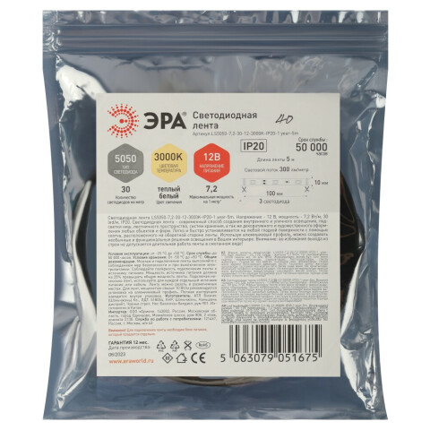 светодиодная лента длиной 5 м, тёплый белый цвет, светодиоды SMD 5050, мощность 7.2 Вт/м, цветовая температура 3000 K, световой поток 300 Лм, питание 12 В, IP20