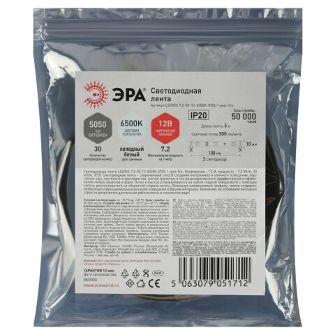 Светодиодная лента ЭРА LS5050 -7,2-30-12-6500K-IP20-1 year-5m_0