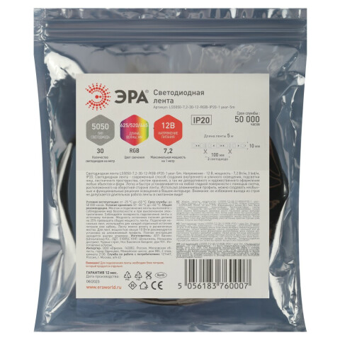Светодиодная лента ЭРА LS5050 -7,2-30-12-RGB-IP20-1 year-5m_0