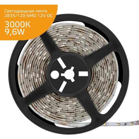 светодиодная лента длиной 5 м, тёплый белый цвет, мощность 9.6 Вт/м, цветовая температура 3000 K, световой поток 340 Лм, питание 12 В, IP20