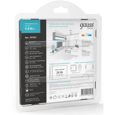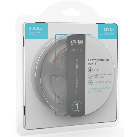 светодиодная лента длиной 2 м, нейтральный белый цвет, светодиоды SMD 2835, мощность 4.8 Вт/м, цветовая температура 4000 K, световой поток 312 Лм, питание 12 В, IP20
