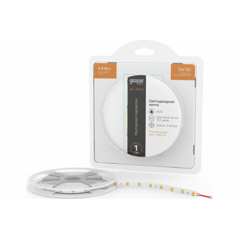 светодиодная лента длиной 2 м, тёплый белый цвет, мощность 4.8 Вт/м, цветовая температура 3000 K, световой поток 312 Лм, питание 12 В, IP20
