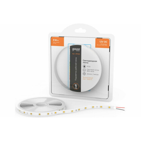 | светодиодная лента длиной 2 м, тёплый белый цвет, мощность 8 Вт/м, цветовая температура 3000 K, световой поток 800 Лм, питание 12 В, IP20 | 97 смн. |