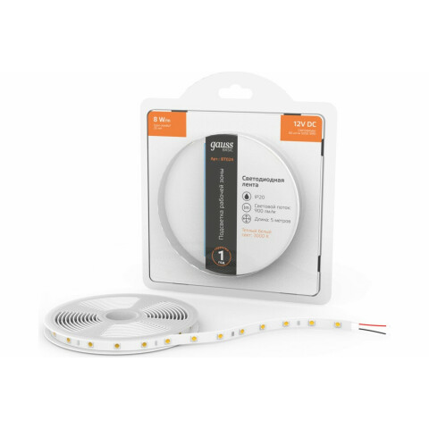 светодиодная лента длиной 5 м, тёплый белый цвет, мощность 8 Вт/м, цветовая температура 3000 K, световой поток 900 Лм, питание 12 В, IP20