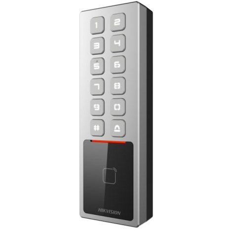 терминал доступа со встроенным считывателем Mifare, кол-во карт: 10 000; кол-во событий: 100 000, встроенный считыватель M1-карт, управление с помощью мобильного приложения (Hik-Connect)