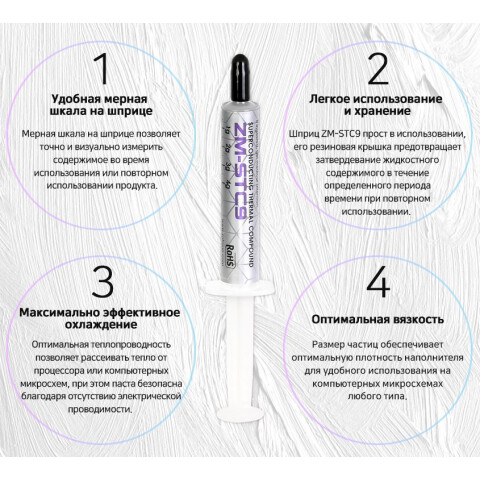 термопаста, теплопроводность: 9.1 Вт/мК, плотность: 2.7 г/см3, вязкость: 2500 Пуаз, лопатка для нанесения, 4 г
