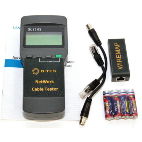многофункциональный тестер с ЖК дисплеем для тестирования телефонного кабеля, коаксиальных и кабелей на основе витых пар 5, 5e и 6 категорий: UTP/STP RJ45, BNC, TEL RJ11/12, определяет расстояние до обрыва кабеля