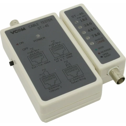 Бренд: VCOMLAN тестер для проверки и ремонта локальных сетей, работает с сетями: EIA/TIA 568A/B, AT&T 258A, 10BASE-T, TOKEN RING; тестер и терминатор работают с разъемами RJ-45 и BNC, питание: батарейка 9V типа "Крона" (приобретается отдельно)