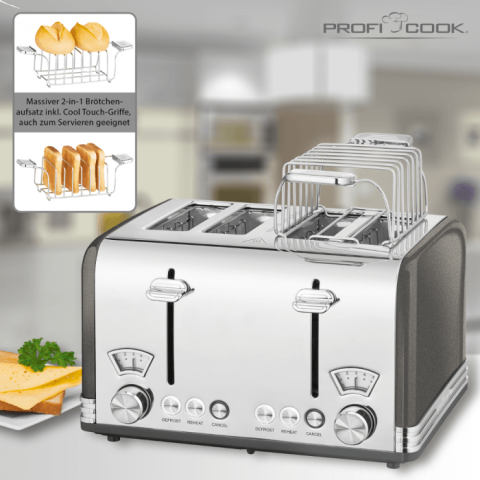 Бренд: Profi Cook1630 Вт, количество тостов: 4, механическое управление, функция размораживания, поддон для крошек, решетка для подогрева булочек