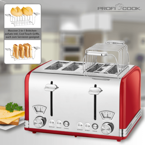 Бренд: Profi Cook1630 Вт, количество тостов: 4, механическое управление, функция размораживания, поддон для крошек, решетка для подогрева булочек