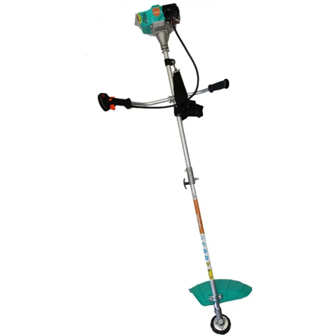 триммер, бензиновый двигатель, режущий элемент: леска и нож, U-образная рукоятка, плечевой ремень