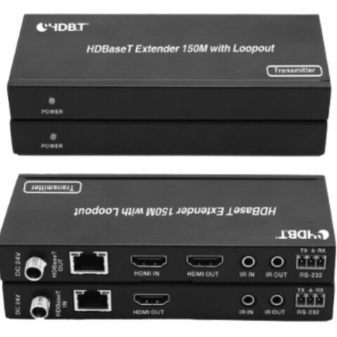 удлинитель сигнала HDMI, HDBaseT, в комплекте Tx (приёмник) и Rx (передатчик), HDMI 1.4 10.2 Гбит/с, передача до 150 м для видео с разрешением до 1080p, двунаправленная передача сигнала ИК и RS-232, POC (Power over Cable), HDCP 1.4
