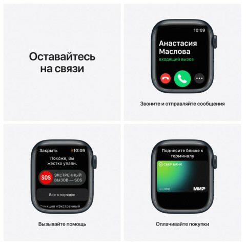 Бренд: Appleумные часы, экран 1.69", OLED, 430x352, Wi-Fi, Bluetooth, GPS, Galileo, ГЛОНАСС, Beidou, аккумулятор 284 мАч, cовместимость с iOS, влагозащита, беспроводная зарядка