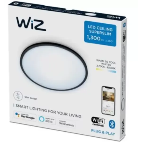Бренд: WiZпотолочная лампа, мощность 16 Вт, цветовая температура 2700-6500 K, световой поток 1500 Лм, управление: Bluetooth, Wi-Fi, до 20000 ч работы