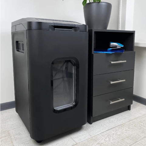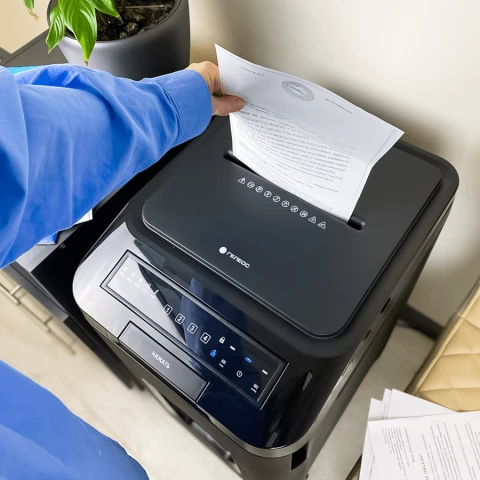 секретность P-4, нарезка фрагментами по 3.9x12 мм, до 15 лист., корзина 55 л, отверстие шириной 240 мм, уничтожение дисков, карт