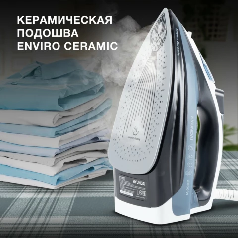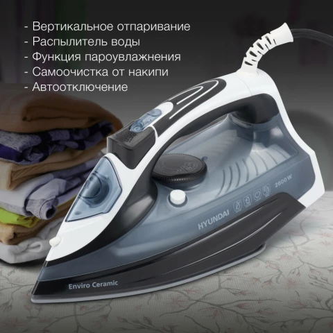 мощность: 2600 Вт, расход при постоянной подаче пара: 20 г/мин, расход при паровом ударе: 180 г/мин, объём резервуара для воды: 300 мл, подошва: керамика (Enviro Ceramic)