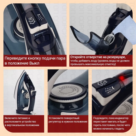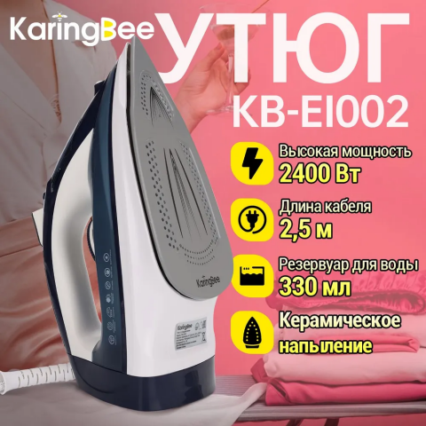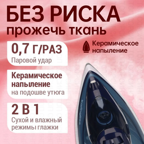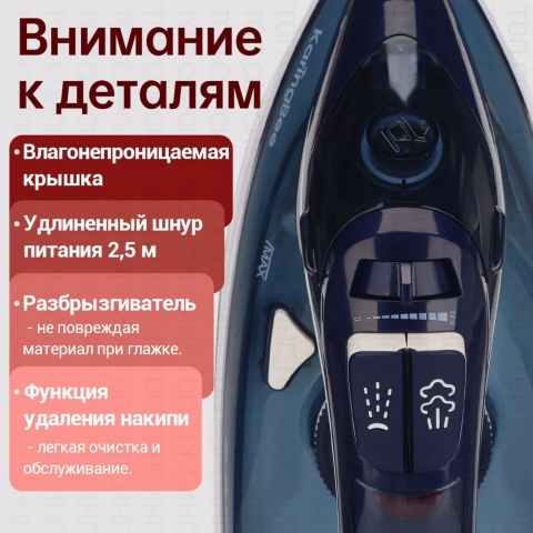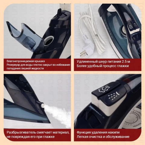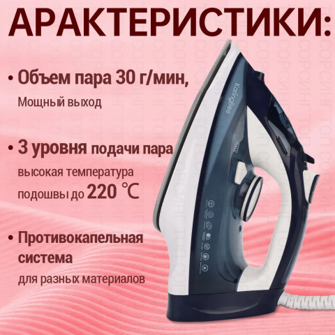 мощность: 2400 Вт, расход при постоянной подаче пара: 30 г/мин, объём резервуара для воды: 330 мл, подошва: керамика