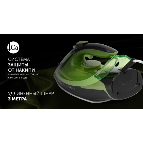 мощность: 2500 Вт, расход при постоянной подаче пара: 50 г/мин, расход при паровом ударе: 150 г/мин, объём резервуара для воды: 300 мл, подошва: керамика (PRO 5 Ceramic)
