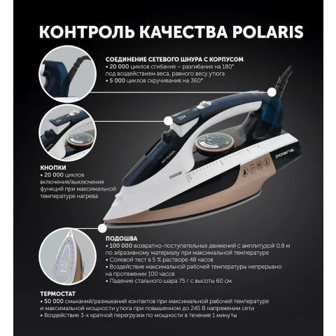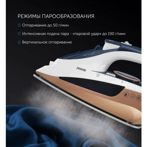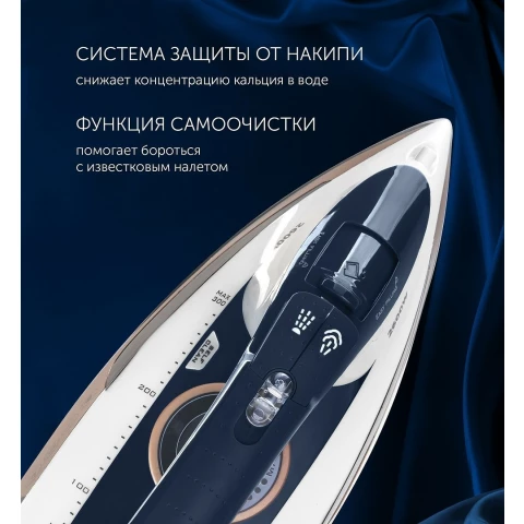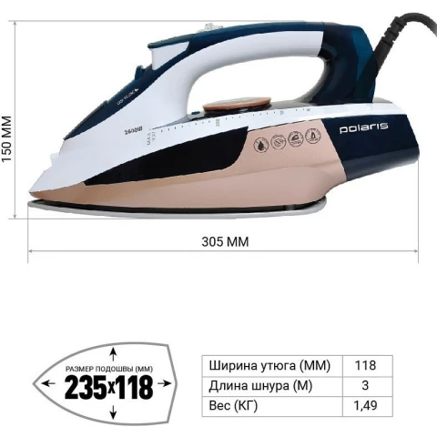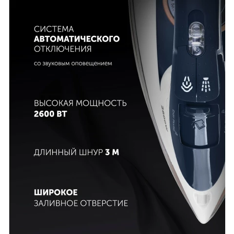 мощность: 2600 Вт, расход при постоянной подаче пара: 50 г/мин, расход при паровом ударе: 190 г/мин, подошва: керамика (PRO 5 Ceramic)