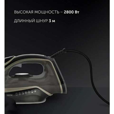 мощность: 2800 Вт, расход при постоянной подаче пара: 50 г/мин, расход при паровом ударе: 200 г/мин, объём резервуара для воды: 400 мл, подошва: керамика (PRO 5 Ceramic)